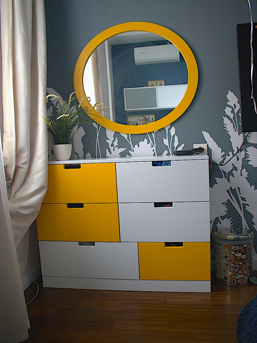 Яркие желтые полки акцент в спокойном интерьере для маленькой девочки.
