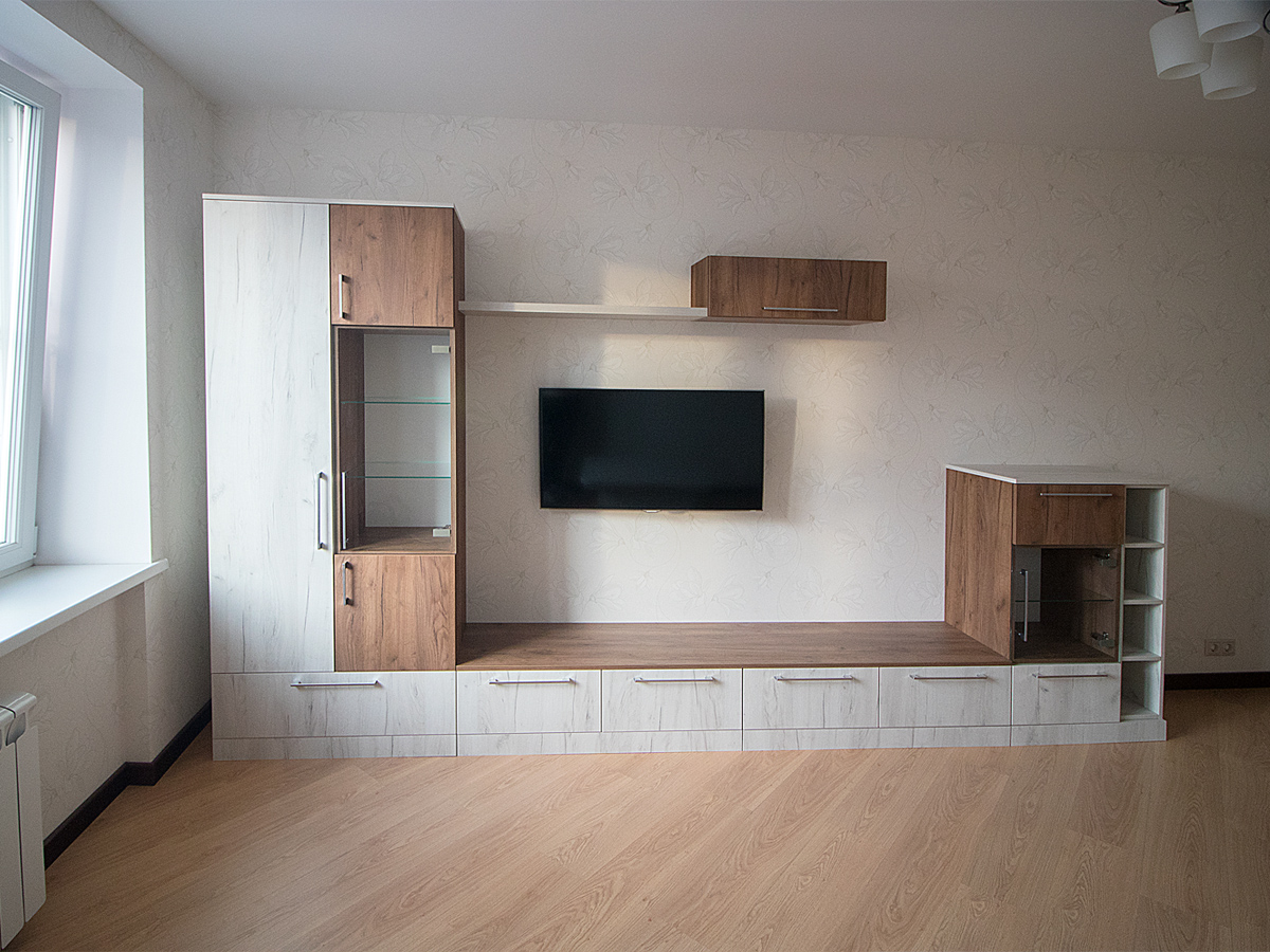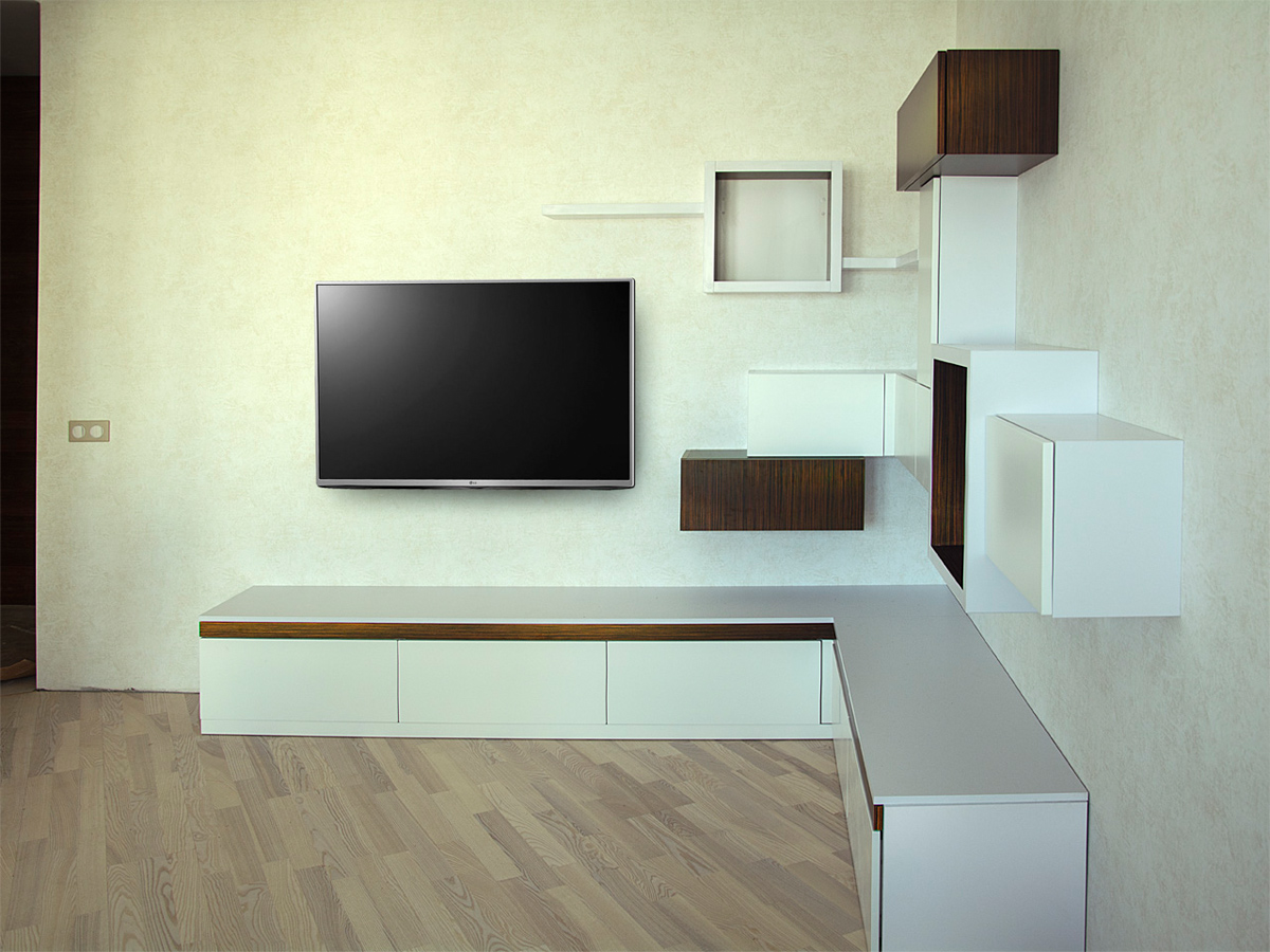 Правильно спроектировав мебель и спланировав пространство, можно в гостиной разместить: модульную стенку, систему открытых полок или подвесных шкафов.