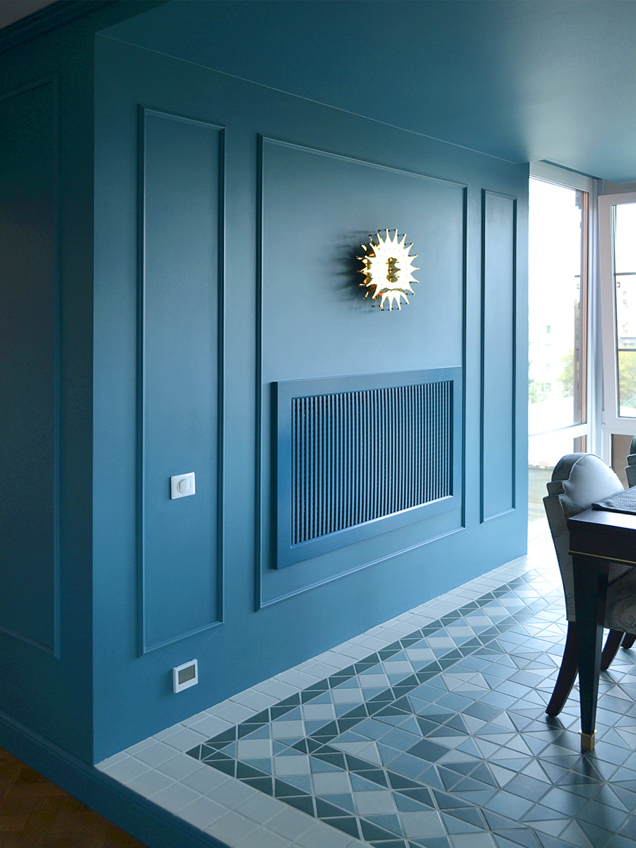 Решетка в цвет стены не только скрывает батарею,но и придает изюминку стене