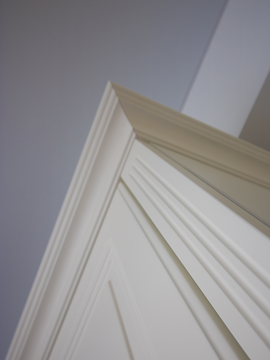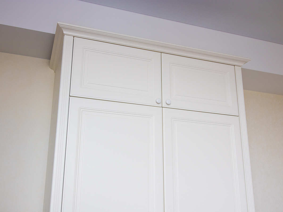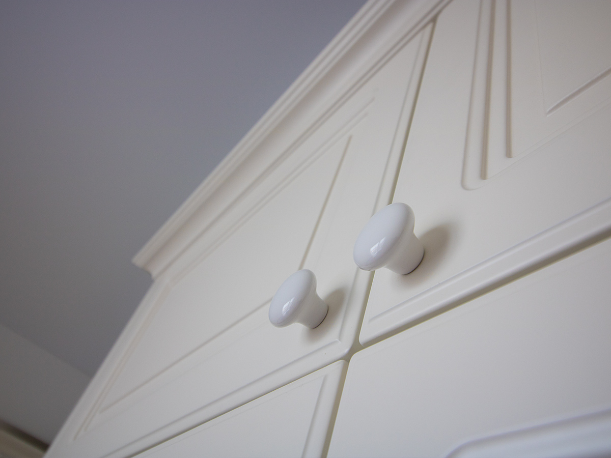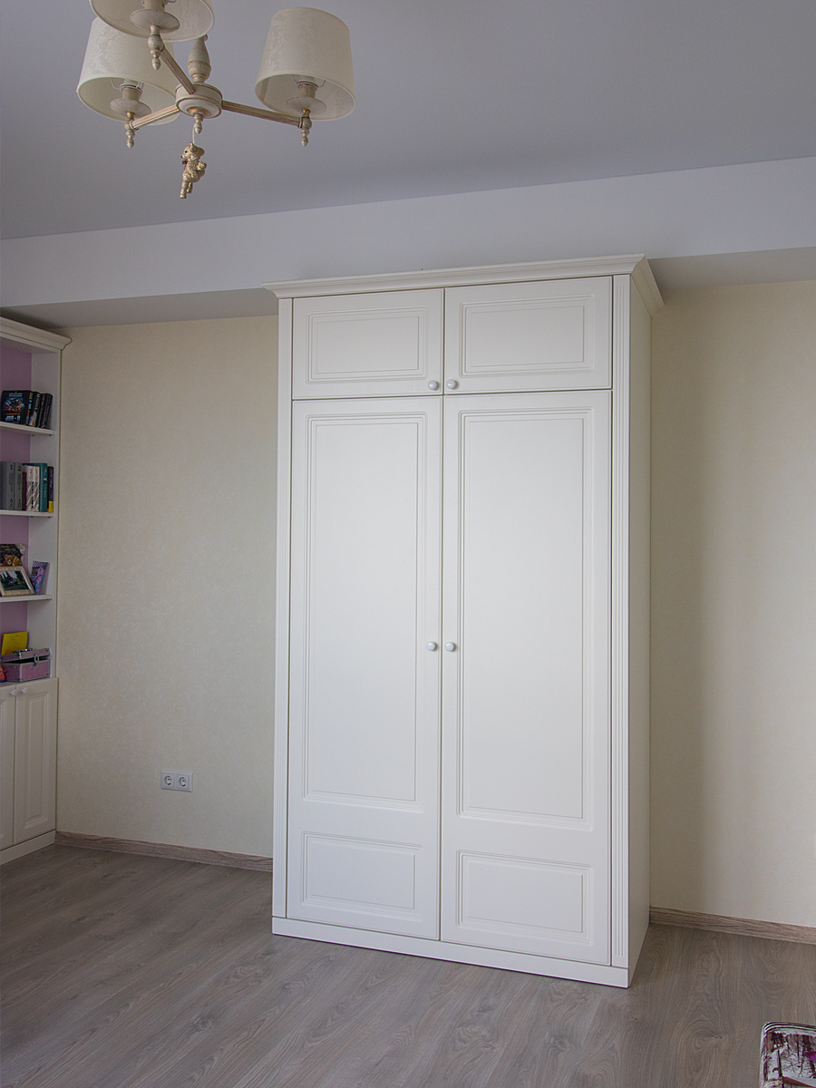 Яркие желтые полки акцент в спокойном интерьере для маленькой девочки.