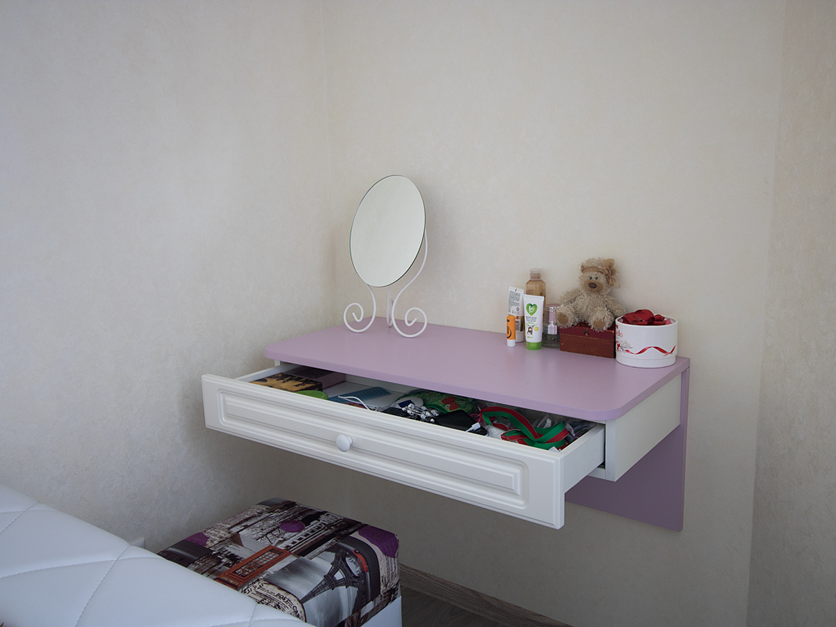 Яркие желтые полки акцент в спокойном интерьере для маленькой девочки.