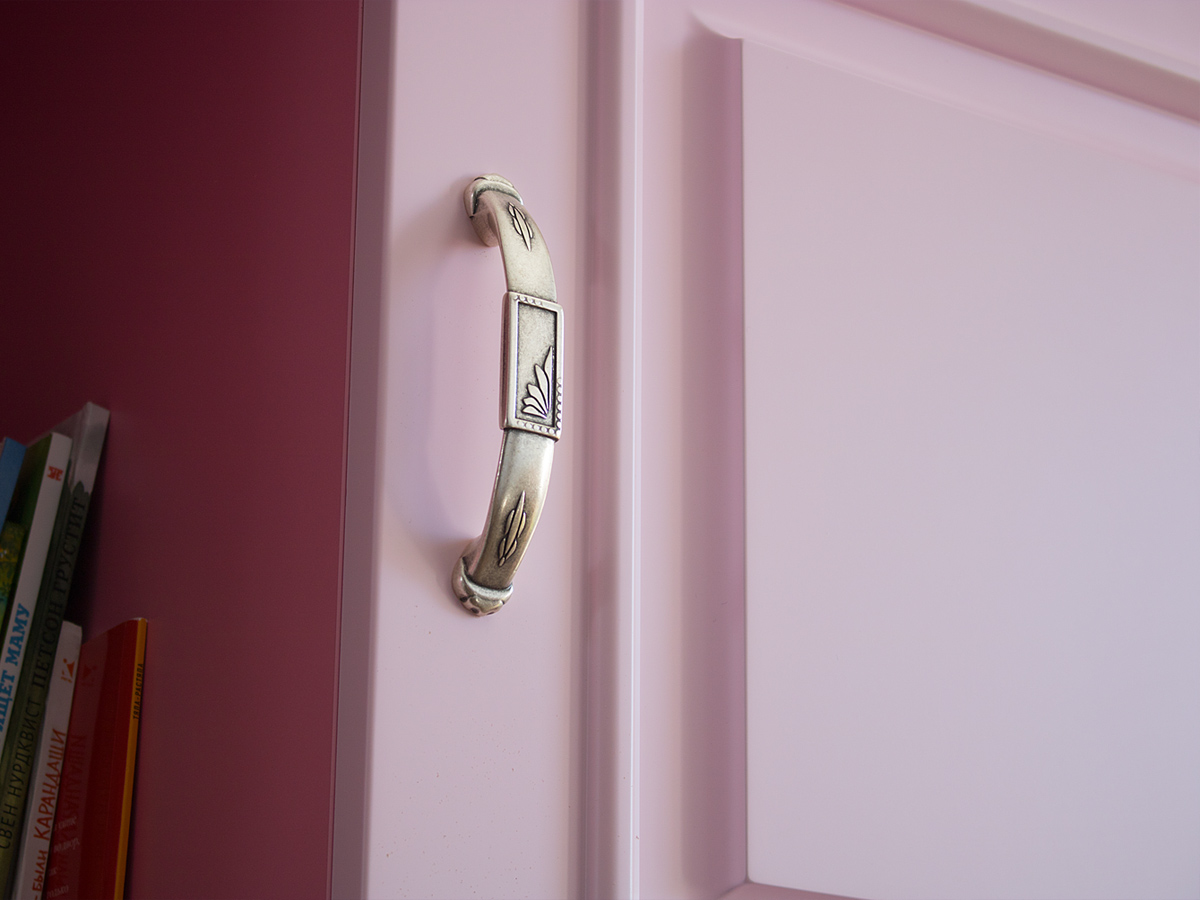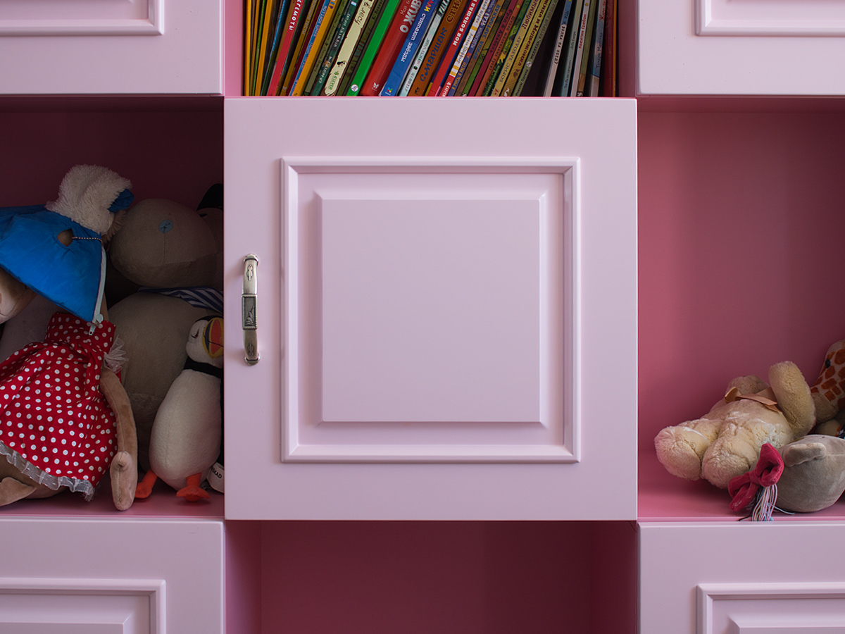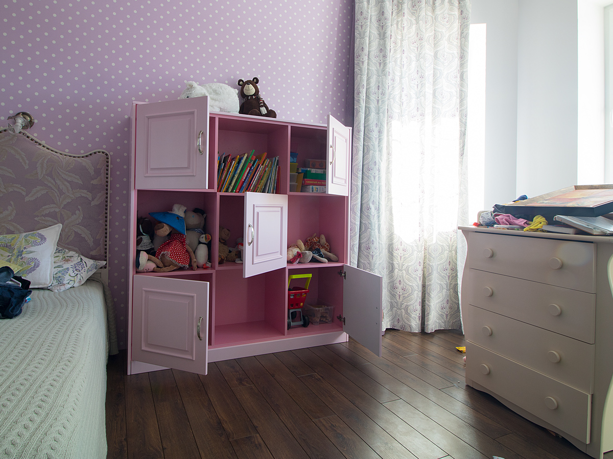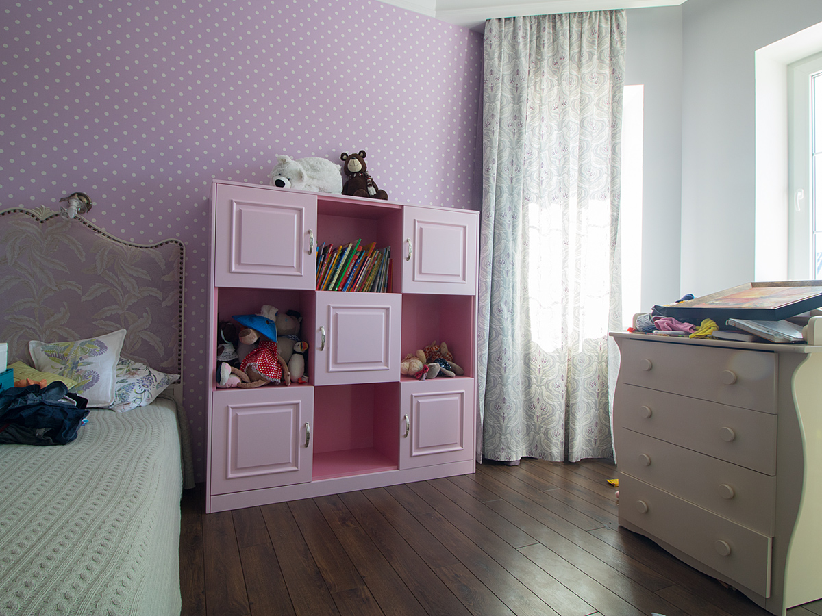 Яркие желтые полки акцент в спокойном интерьере для маленькой девочки.