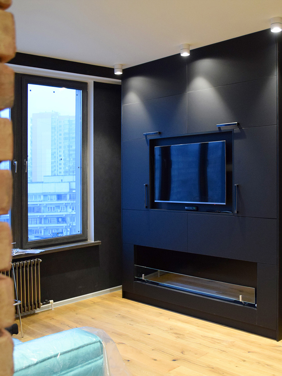 Классная идея телевизор на стене и рейки из ДСП на заднем плане.