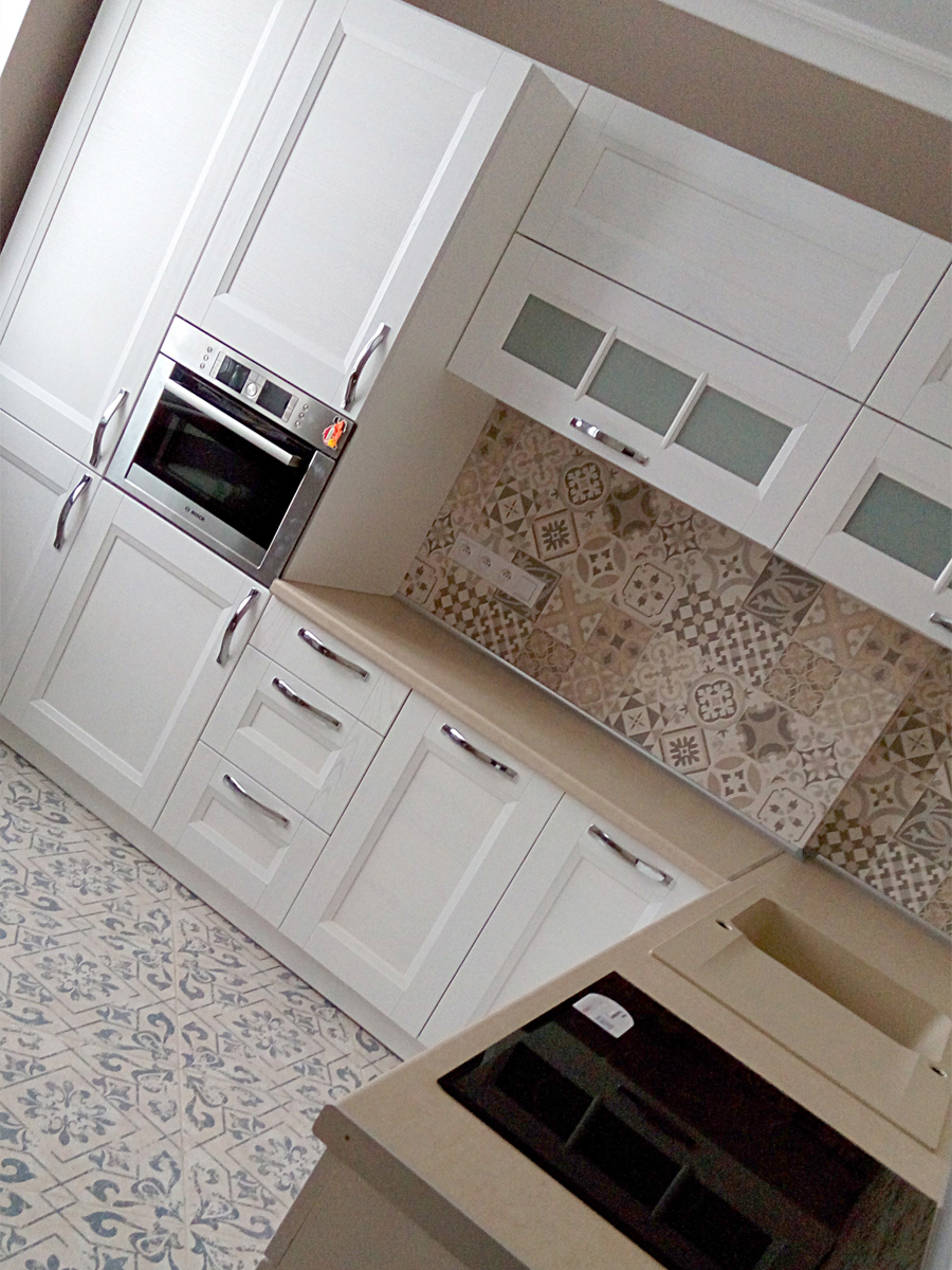 Необыкновенное сочетание плитки в этническом стиле и кухни из массива ясеня.