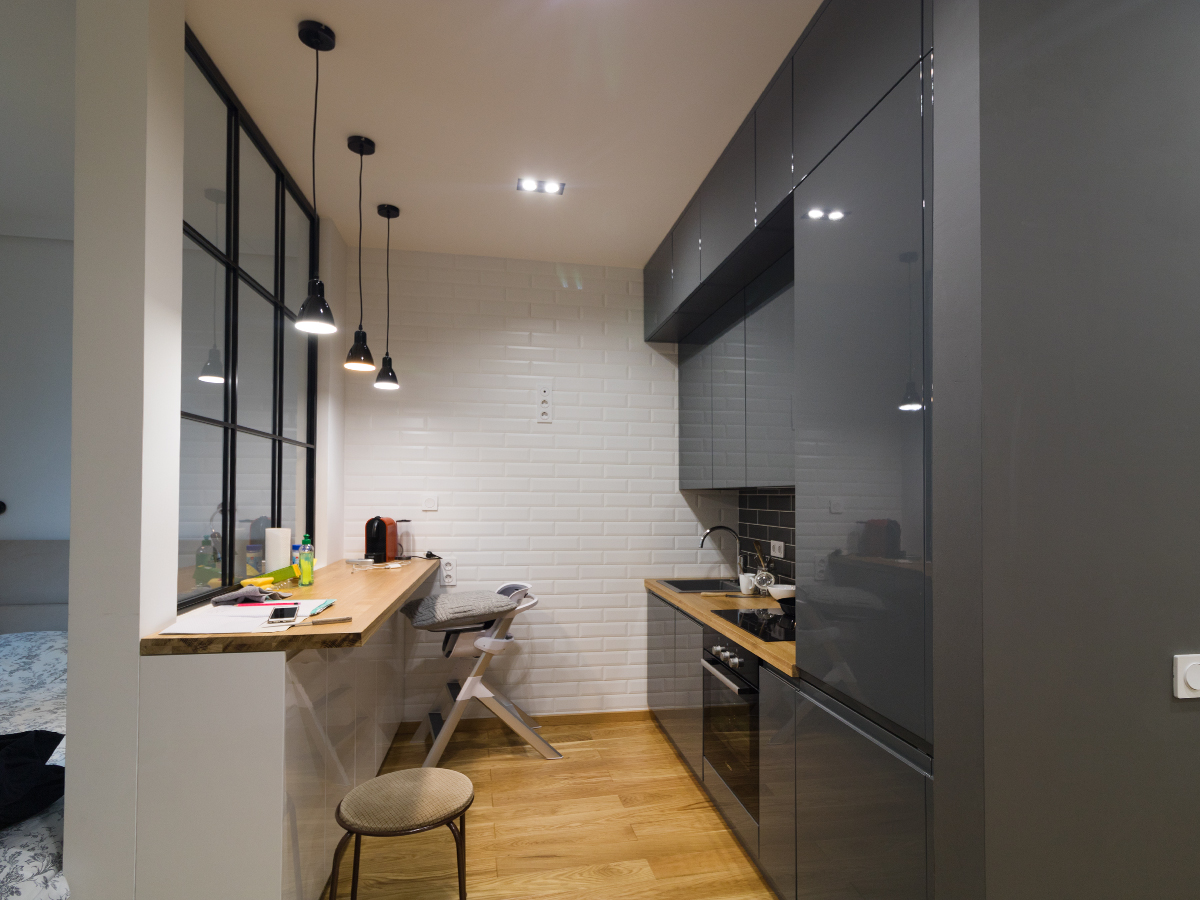 Стильное сочетание чёрной столешницы из акрилового камня и белоснежных фасадов.