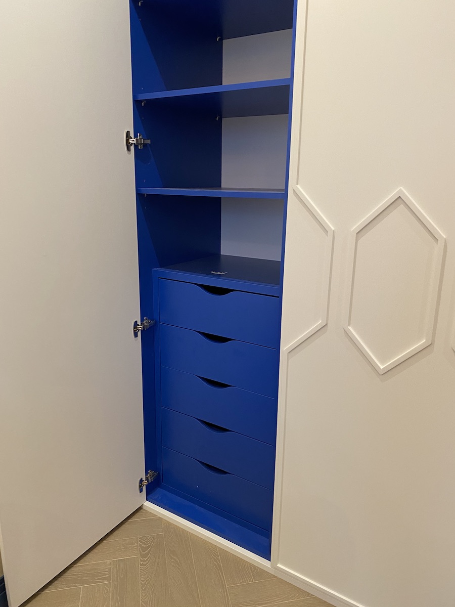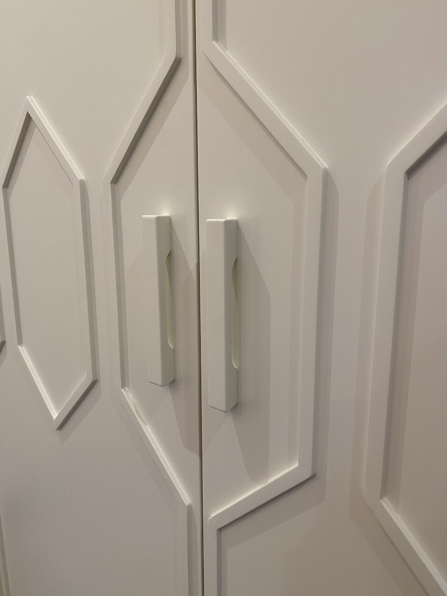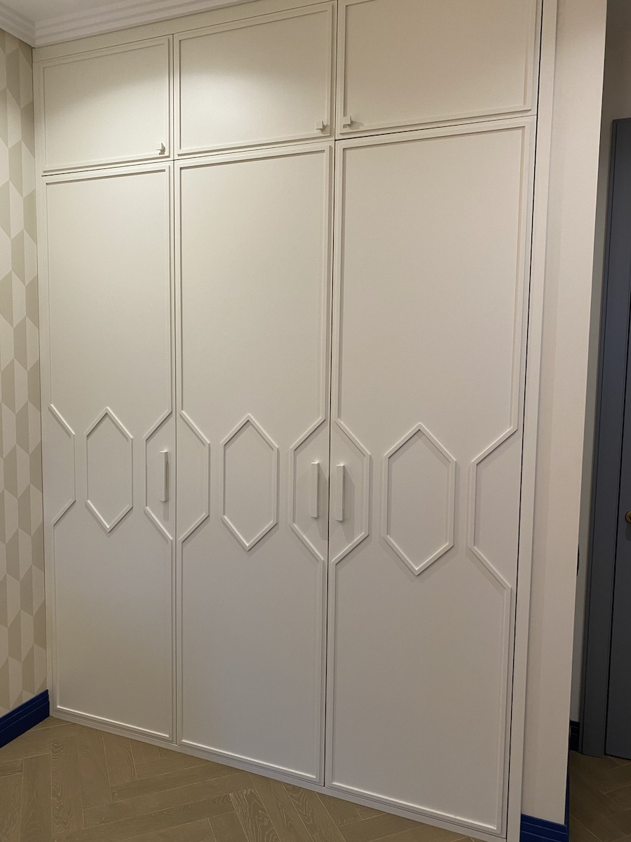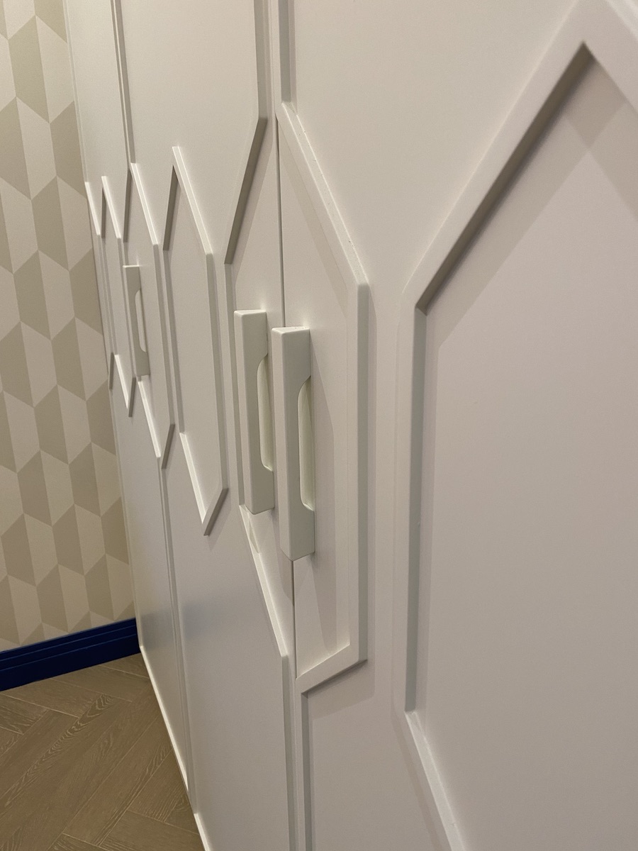 Геометрия в фасадах повторяет геометрию на обоях,благодаря этому создается объем и глубина.