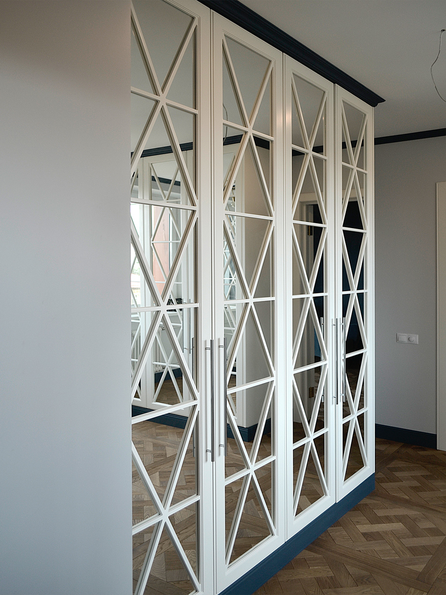 Стильные хромированные ручки дополняют простой шкаф.