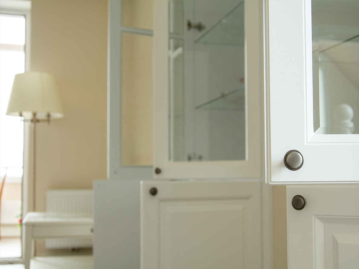 Стильные хромированные ручки дополняют простой шкаф.