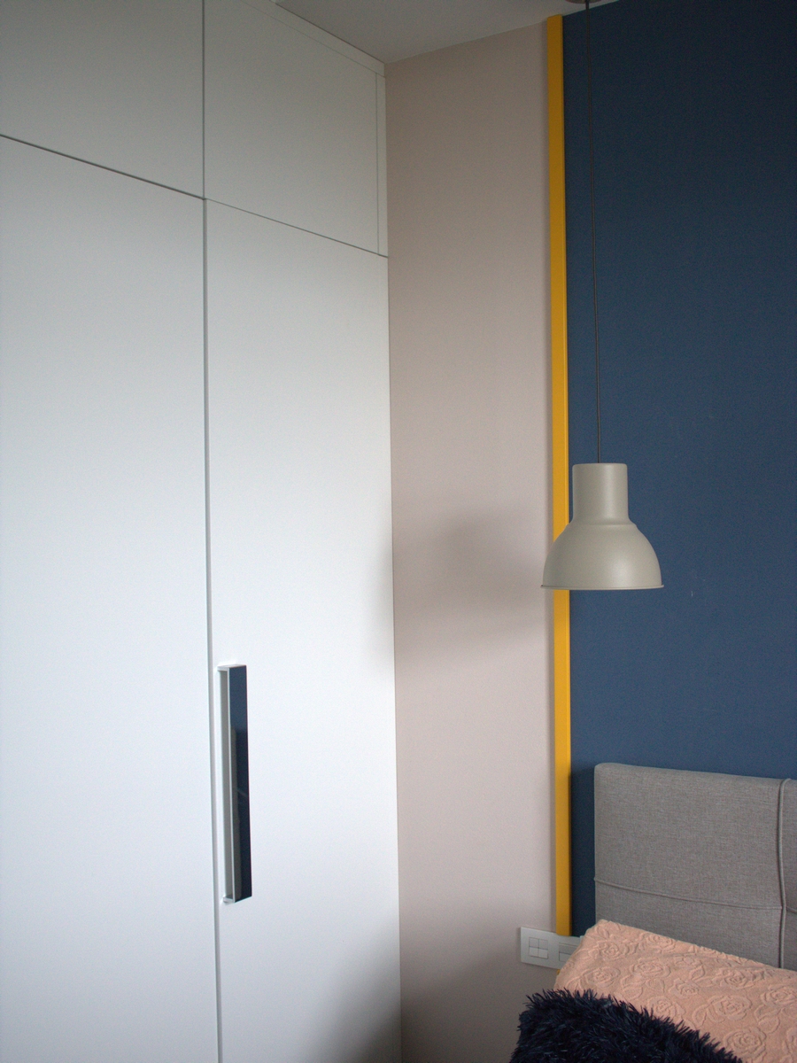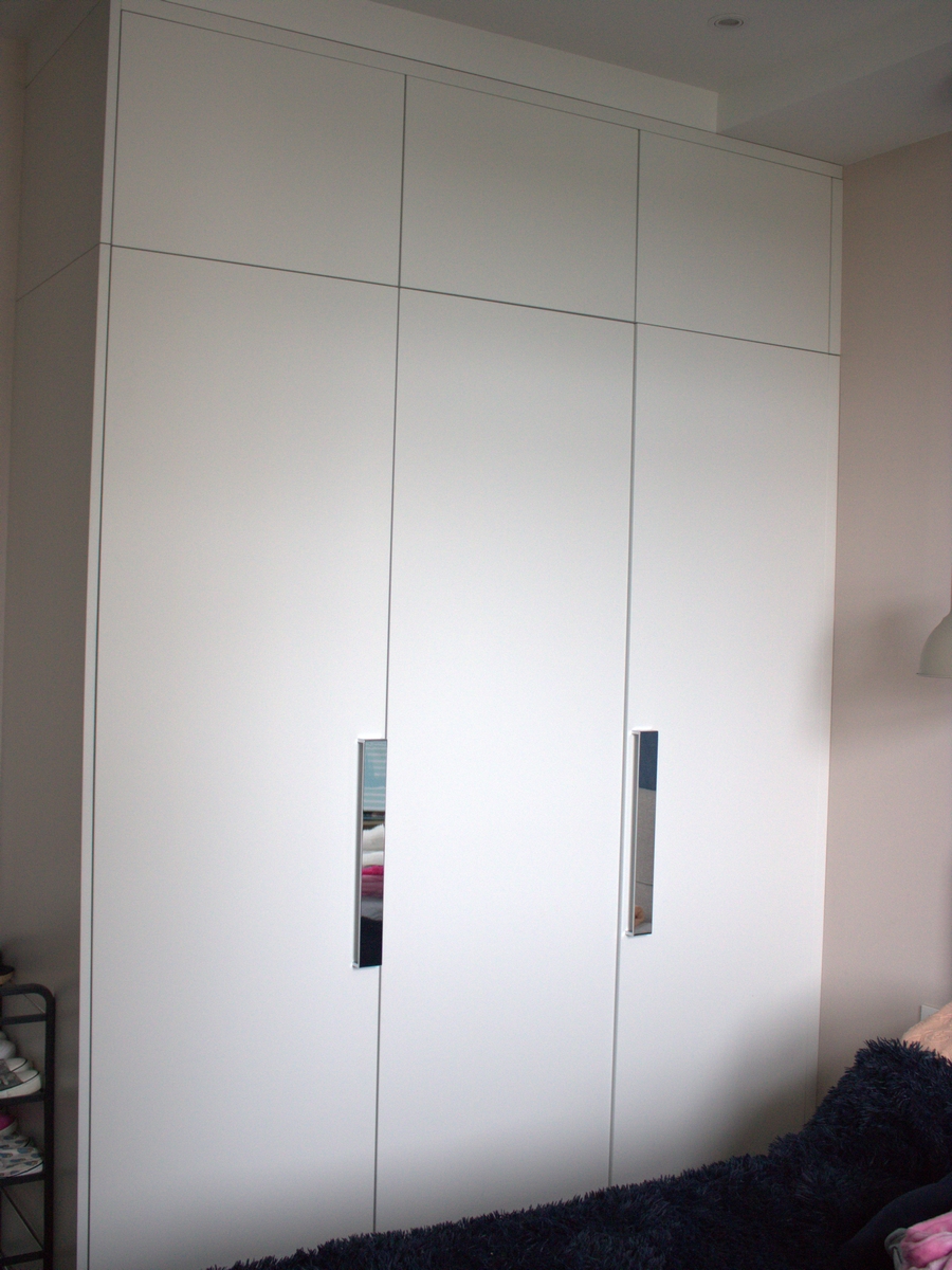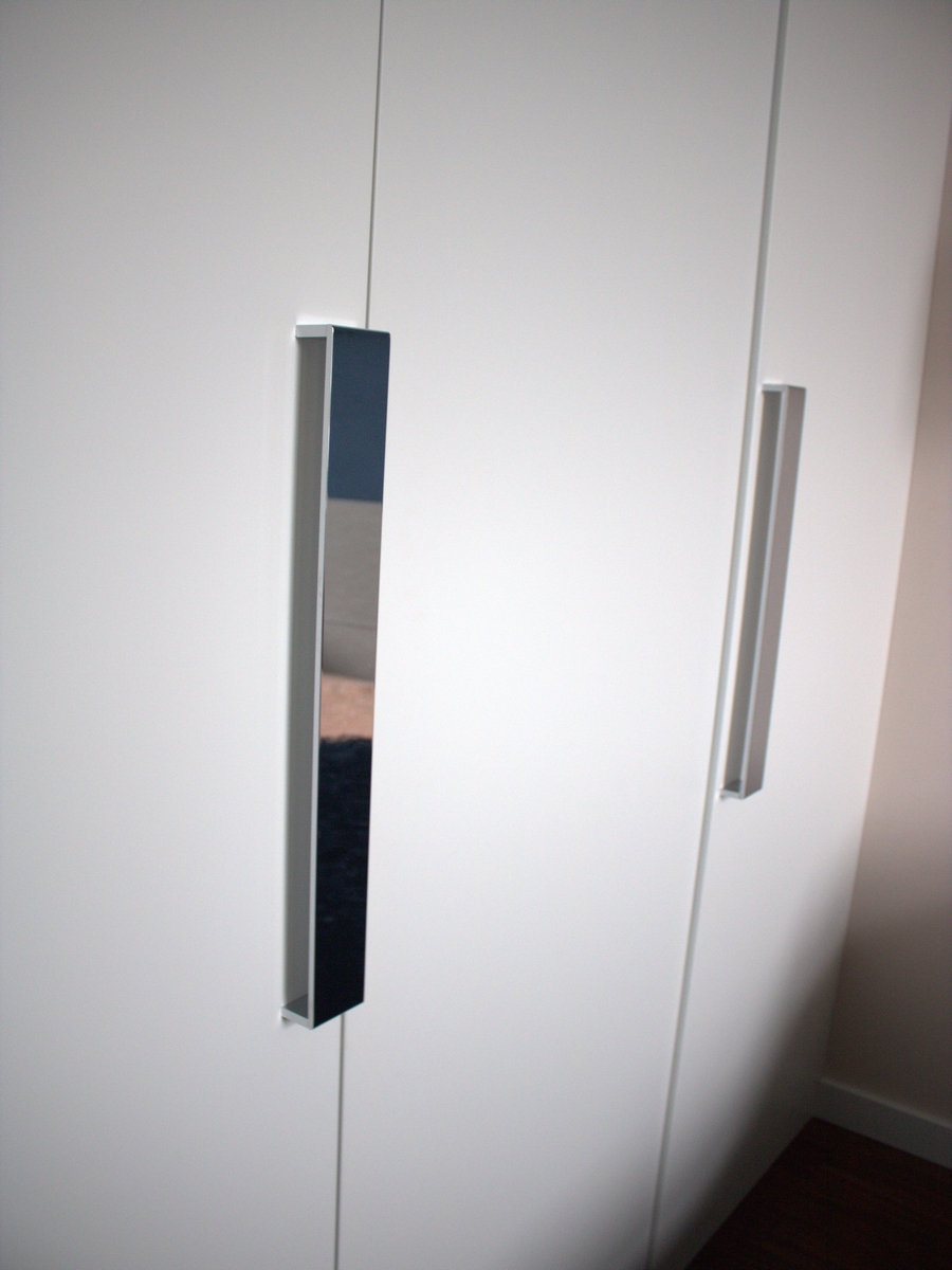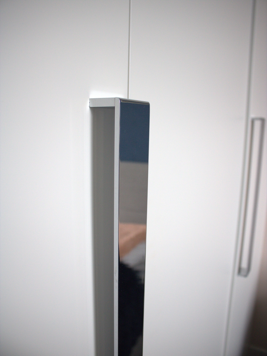 Стильные хромированные ручки дополняют простой шкаф.