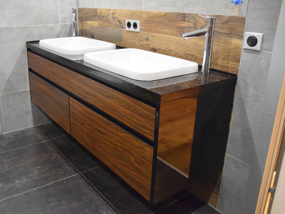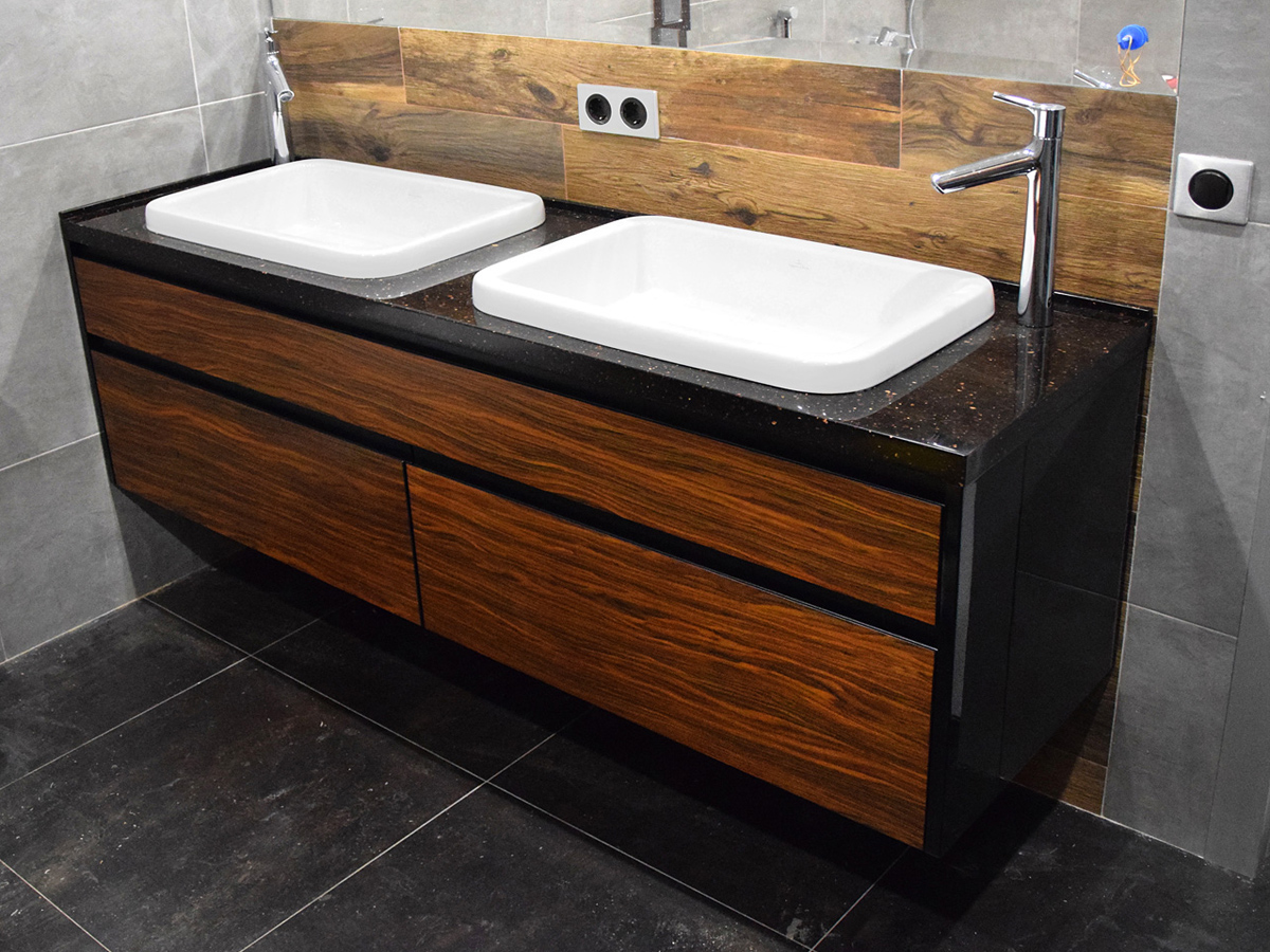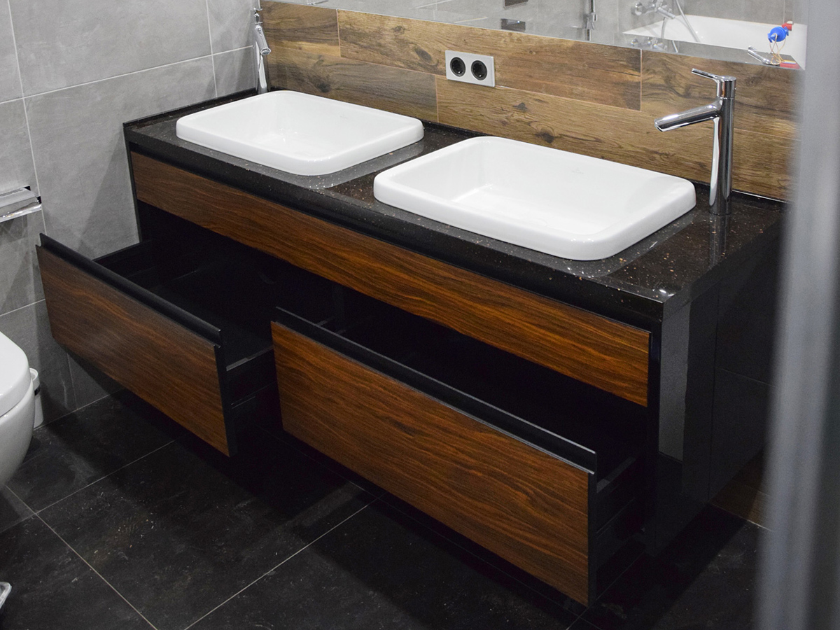 Брутальная тумба со шпонированными вставками и акриловой столешницей.