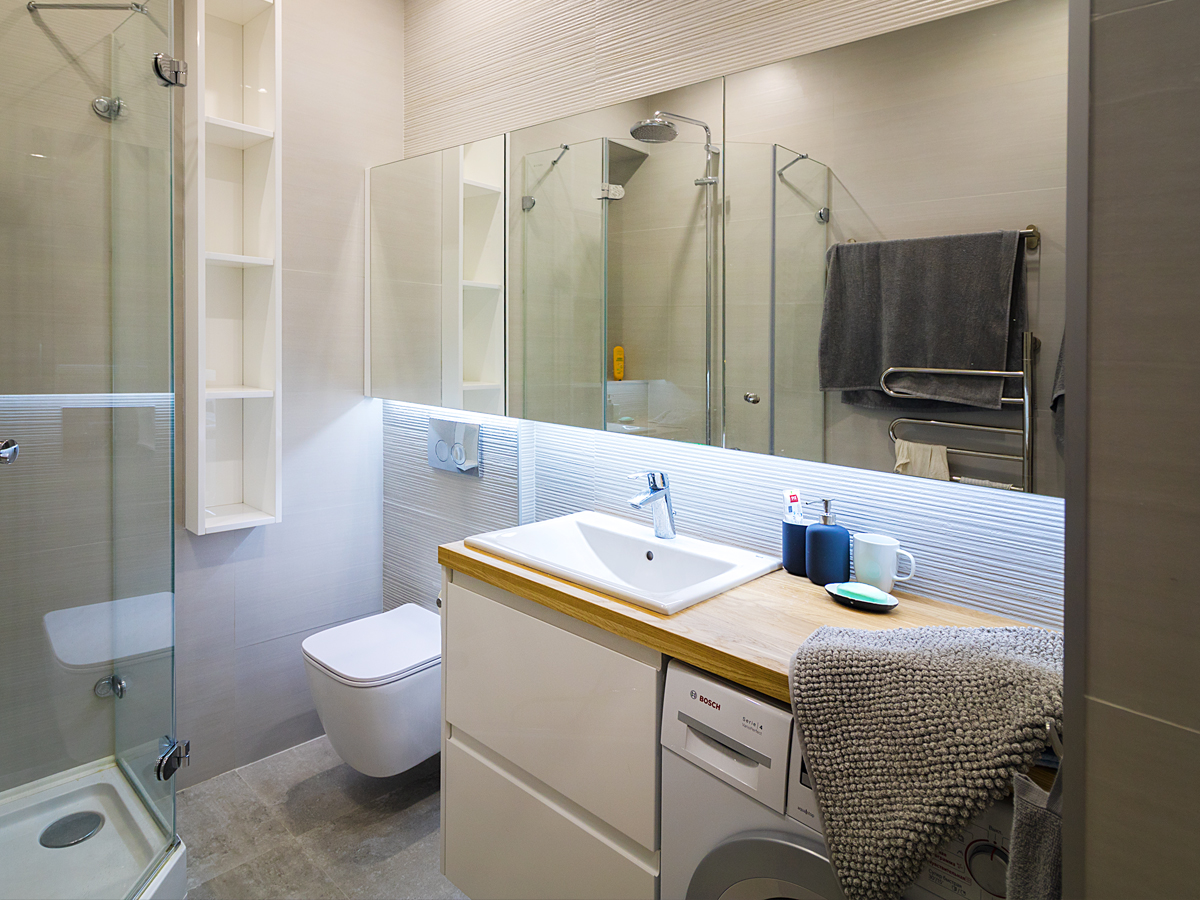 Тумба  рядом со стиральной машиной и со столешницей из массива дуба.