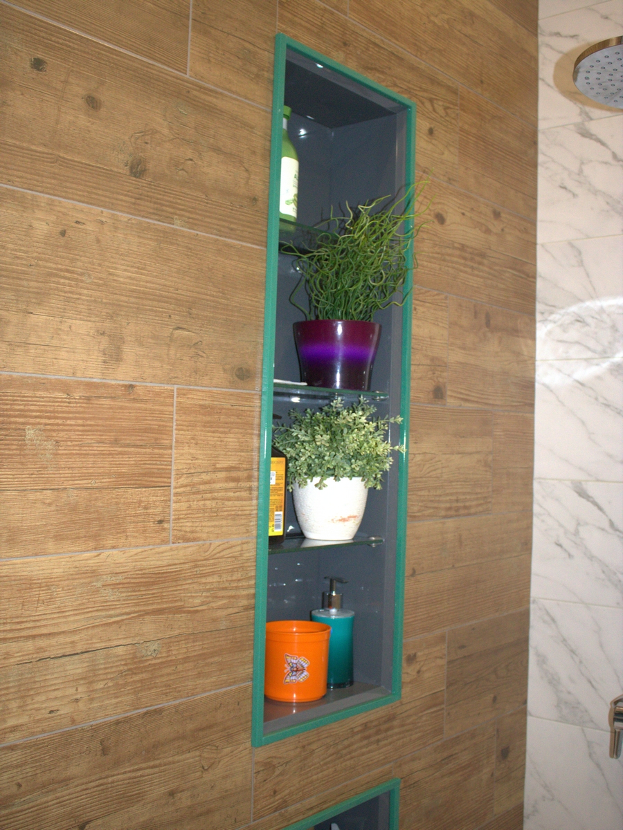 Встроенные полки из крашенного глянцевого МДФ в ниши.